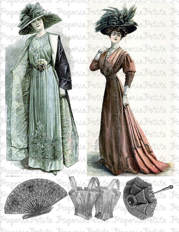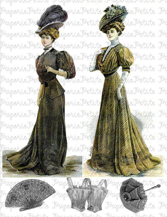 Victorian Women of Fashion Digital Download Collage Sheet A This high resolution 300 dpi digital collage sheet includes two Victorian women dressed in beautiful fashion from the Victorian times. Included at the bottom of the page is a fan, corset, and parasol. The woman on the left has a dress
